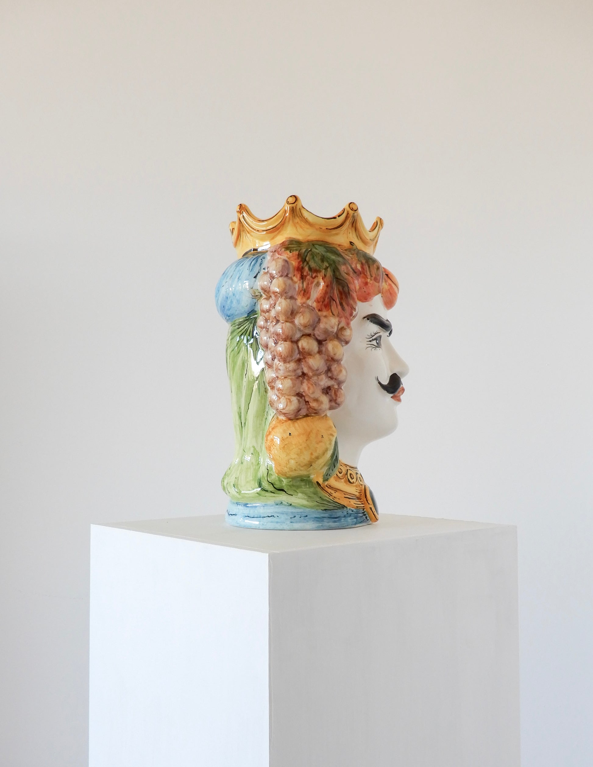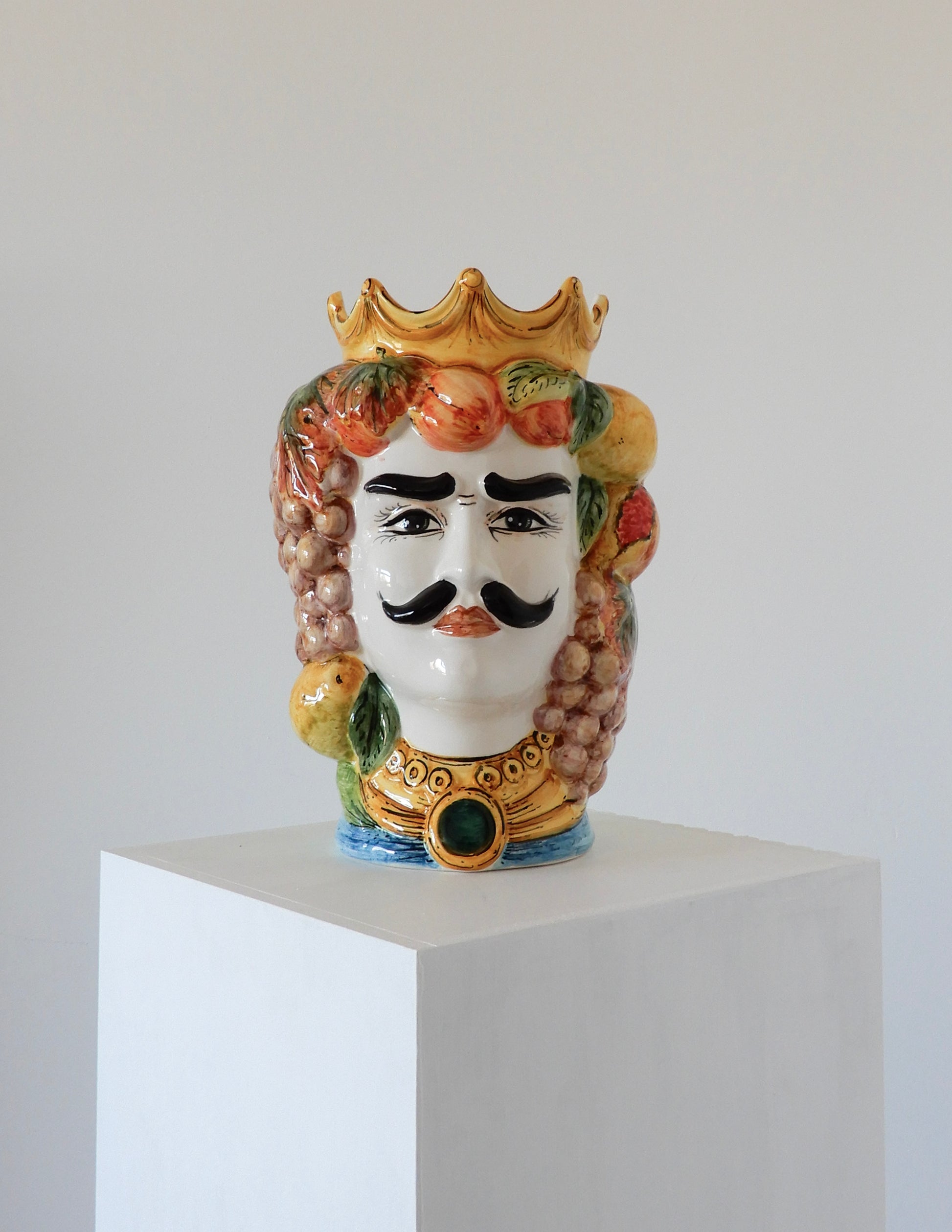 The Testa di Moro ("Moor's Head") is a Sicilian legend about a woman who falls in love with a Moorish man. After he leaves her, she is heartbroken, but when he returns, she kills him in revenge for his betrayal and decapitates him. She places his head in her garden, where it becomes a planter, symbolizing both love and revenge. The iconic ceramic heads, often used as decorative pieces, represent Sicily's mix of cultures, including the influence of the Moors.